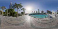 A breathtaking 360-view of Dubai's city skyline, featuring impressive high-rise buildings and skyscrapers. The circular fountain and palm trees add a touch of elegance to the urban landscape. This metropolitan area offers a blend of architectural marvels and open spaces for recreational activities.