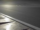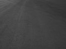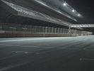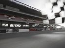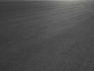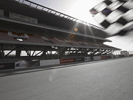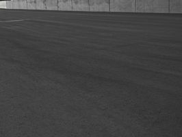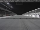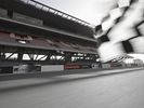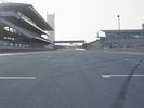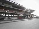 A monochromatic view of an empty race track in Dubai. The fisheye lens captures the straight road and the curve of the track. One car can be seen coming out, adding a sense of movement to the stillness.