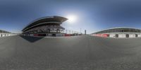 the view from the inside of a fisheye lens of an empty track with one car coming out