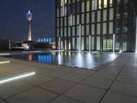 This photo captures the vibrant cityscape of Duesseldorf, Germany at night. The image showcases a pool near a modern building with a television tower in the background, reflecting the artificial lights of the cityscape. The clear sky above contrasts with the brightly lit skyscrapers and street lights below. This metropolitan area is known for its innovative architecture and mixed-use structures. The photograph also features open spaces, such as plazas and courtyards, which provide a contrast to the urban environment. Duesseldorf is a bustling metropolis in Europe, known for its industrial and cultural significance.