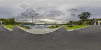 a panoramic view of skateboards in a parking lot at dusk with some cars and buildings