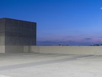 Dusk in Los Angeles, California. Empty parking lot next to towering city buildings. Moon shining brightly in the background. Composite material facades contrast against the dark horizon. A surreal cityscape.