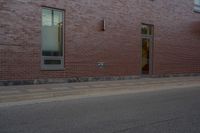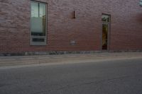 a skateboard on the street next to a brick building with windows and a yellow fire hydrant in front of it
