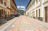 A picturesque street in Ecuador, lined with classic architecture and stone pavements. The green mountains in the distance add to the charm of this urban neighborhood. Experience the beauty of city life in Ecuador.