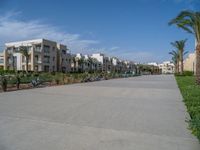 Modern architecture in Egypt's coastal residential area. Concrete streets intersect palm-lined roads leading to the ocean. Clouds fill the sky over the urban landscape, a blend of tradition and modernity.