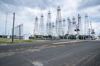 This stock photo features several transmission towers that are located in the middle of a street in Dallas. The towers stand tall and are surrounded by a rural landscape with trees and a factory in the background. The image captures a sunny day with clouds in the sky. The towers form an essential part of the infrastructure for electricity transmission, with numerous overhead power lines running along the road. The road surface, made of asphalt, leads the viewer's gaze towards the towers, highlighting their significance in the industrial setting.