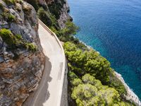 An aerial view of a high coastal road in Mallorca, Spain. The elevated perspective showcases the stunning coastal landscape and the crystal clear waters of the Balearic Islands. A perfect day to enjoy the natural beauty of Europe.