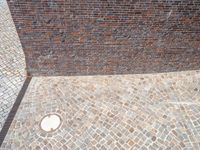 This image captures the architecture and urban design of a residential area in Hamburg, Germany. The elevated road surface features brickwork and cobblestone, which adds to the charm of the city. The modern buildings with their beige facades create a striking contrast against the brick walls. The manhole covers and rectangular flooring enhance the urban aesthetic. This photo represents a typical day in Hamburg, showcasing the combination of historic and modern elements in the city's architecture.