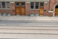 a red fire hydrant is sitting in front of a brick building and doors on the corner