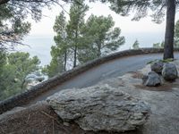 This stunning stock photo features an elevated coastal road in Mallorca, Spain. The image captures a curved asphalt road winding through the mountains at dusk. Lined with trees and with a cliff on one side, the road offers breathtaking views of the ocean in the distance. The clear sky above adds to the picturesque scenery. The image showcases the beautiful natural landscape of Mallorca, one of the Balearic Islands in Europe. It is a perfect depiction of an idyllic high coastal drive that will inspire anyone with a love for nature and adventure.