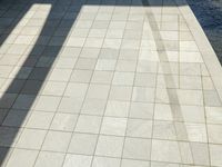 Top down view of a modern concrete platform near the lake shore in Berlin. The elevated architecture features a line pattern and rectangular tiles. Beige color scheme creates a clean and contemporary look.