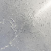 A top-down view of an elevated concrete structure in a monochrome landscape. The surface covered in snow and ice creates a freezing atmosphere. The white and grey monochromatic colors add to the stark beauty of the scene.