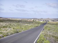 a long, empty road in the open land near the coast area with buildings on each side