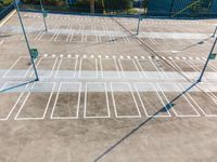 This image captures an aerial view of an empty parking lot in a city park in the Netherlands. Surrounding the parking lot are various modern architecture buildings, creating a high and urban design. The open space is made of composite material and concrete, with a grassy slope leading to the parking deck. The cityscape showcases the blend of rectangle and circle shapes, representing the architectural diversity of Europe. This photo depicts a clear day in Holland, highlighting the elevated view and the functionality of public utilities.