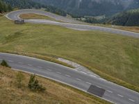 Aerial view of an elevated road winding through the picturesque landscape of the Austrian highlands. The road surface blends harmoniously with the natural environment, surrounded by grassy slopes and towering trees. Experience the beauty of rural Europe.