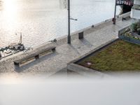 An elevated view of Bremerhaven's city life with the harbor in the foreground. The high road surfaces and cobblestone streets are lined with street lights. Urban design meets the jetty and landing boats along the pier.