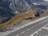 This is an image of an asphalt road winding through a breathtaking landscape of mountains in Austria. The clear sky overhead contrasts with the lush green trees and highlands surrounding the road. The high elevation of the terrain provides a top-down view of the road and the Armco barrier protecting it. The road surface appears well-maintained and is a crucial infrastructure for transportation in this picturesque European country. This photo captures the beauty of Austria's natural scenery and the importance of its road network in connecting different regions.