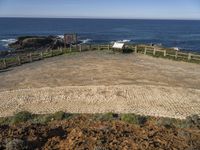 A stunning view of the European coastline in Portugal. The azure sky and clear water contrast with the elevated road and Armco barrier. The surrounding landscape is filled with grass and open spaces, perfect for nature lovers.
