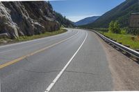 Elevated road on Berthoud Pass in Colorado, USA. Clear sky, towering mountains, and lush green landscape surround the asphalt highway. Armco barriers line the high road, ensuring safety. A picturesque day in nature.