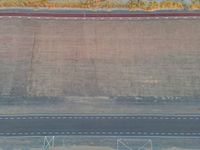 This stock photo features a top-down view of an elevated road in Holland at dawn. The road, made of composite material, is in a rectangular shape with a grey and beige pattern. The surrounding landscape showcases the beautiful coastal area of Holland, with an open space and the ocean in the background. The image highlights the natural beauty of Holland and its high-quality road infrastructure.