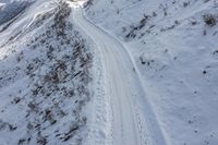 An aerial view of an elevated road in Italy, surrounded by snow-covered mountains and a frozen garden. The road winds through the high terrain, with S-curves and curves. A breathtaking winter landscape in Europe.