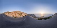 Panoramic view of an elevated road along the coastal landscape of Mallorca, Spain. The straight road leads to a lighthouse overlooking the clear sky and the vast ocean. The Armco barrier provides a high level of safety. A breathtaking sunset scene in the Balearic Islands.