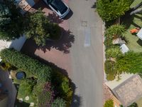 a view down on a residential neighborhood and parking lot from above, looking down onto a parking lot in the middle of it