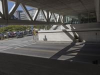an outdoor area with a walkway and a very wide street filled with cars on the side