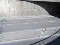 a concrete wall with shadows on it and a street intersection with no cars in it