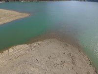 Aerial view of Mallorca, one of the Balearic Islands in Spain. The river flows near the coast, surrounded by mountains and open spaces. The clear water and sandy shore add to the natural beauty of this European island.