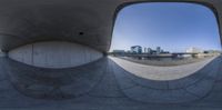 a distorted view of a city with buildings in the background and fish eye lens in foreground