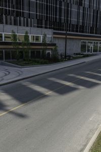 An elevated view of an empty city street in Toronto, with a bike rider passing by a building. The sunny day highlights the industrial facades and warehouses in the area.