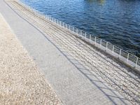 An elevated top-down view of a coastal city in Germany. The road surface is lined with cobblestones and fences, leading to a suburban park with a pier. The urban landscape is juxtaposed with the high ocean shore.