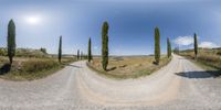 A wide lens photo of a dirt road in Tuscany, Italy. A row of cypress trees creates a high, straight down the road view. The rugged landscape of rural Europe is elevated by the clear sky and the sun shining on the harvest garden.