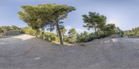 Elevated view of Mallorca's coastal road, surrounded by the clear blue ocean. A tree stands tall amidst a rocky slope, adding to the natural landscape. The top-down perspective captures the beauty of Balearic Islands.