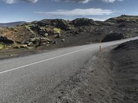 an empty asphalt road with rocks in the distance under blue cloudy skies near lava and green mountains