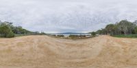 an empty beach near a wide body of water and trees and clouds in the air