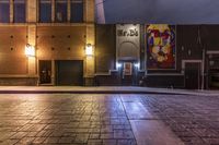 This stock photo captures an empty brick alley in Detroit, Michigan, illuminated by neon street lights and artificial light. The classic architecture of the buildings and graffiti-covered walls create a unique and urban atmosphere. The large poster of a woman standing at the door adds intrigue to the scene. The cobblestone walkway and brick walls provide a timeless charm to the cityscape. This photo is perfect for showcasing the vibrant and gritty side of Detroit's nightlife and infrastructure.