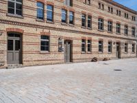 This stock photo depicts an empty brick sidewalk outside a large building in Berlin, Germany. The building features classic architecture and is located near a clock tower. The brick wall adds to the city charm and the open space is perfect for urban design. The clear sky creates a beautiful backdrop for this urban scene.