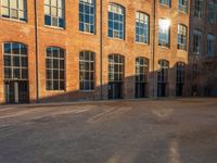 This stock photo features an empty brick square in Barcelona, Spain. The square is surrounded by large buildings with lots of windows, and it is bathed in sunlight. In the foreground, there is a blue fire hydrant. The brick wall of the square adds a touch of classic architecture to the scene. The clear sky above and the hard shadows created by the buildings give the photo a dramatic effect. This photo captures the essence of Barcelona's cultural center and the beautiful European architecture found in the city. The surface of the square is covered in dirt and gravel, adding texture to the image.
