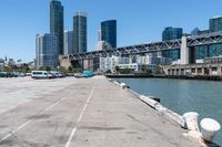 This stock photo features an empty bridge on an asphalt road in an urban setting. In the background, you can see a stunning cityscape of San Francisco with its iconic skyline, nestled along the coastal area. The road leads straight towards the city, while the sparkling waters of the ocean glisten under the clear sky. A pier and jetty can be seen off to the side, adding to the charm of this urban harbor scene. It's a perfect representation of a serene day in San Francisco, where the bridge and city meet in harmony.