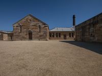 An empty building surrounded by a courtyard in a rural landscape. The clear sky casts hard shadows on the building's facade and roof. The open space and dirt and gravel surface add to the desolate atmosphere.