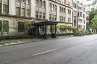 A photo of an empty bus stop located on a city street in Chicago, Illinois. The bus stop is surrounded by tall buildings, showcasing the urban architectural landscape of the city. The road in front of the bus stop is made of asphalt, and it is a residential area with houses and properties nearby. This photo was taken during the day, capturing the vibrant atmosphere of the town. The image represents the contemporary urban transport and the classic architecture that characterizes the city, including hotels and other notable buildings.