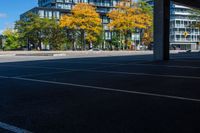 This stock photo shows an empty car park area in urban Toronto, Ontario, Canada. The asphalt surface reflects the bright daylight and creates hard shadows. In the foreground, a bus patiently waits for passengers. Surrounding the car park are various urban elements, including homes, houses, and a mall, all casting shadows against the urban design of the city. The sky is filled with fluffy clouds, creating a picturesque backdrop.