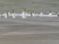 an empty car parking lot with no cars on it's sides and signs in red
