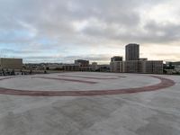 This stock photo features an empty circular parking lot, located in the bustling city of Los Angeles. The futuristic architecture of the surrounding buildings creates a visually stunning skyline. In the background, you can see clouds floating in the sky, adding to the beauty of the scene. The image captures the essence of urban life, with a touch of modern architecture and a break of day's dawn. The concrete surface of the parking lot, along with a visible helipad, gives the image an urban and business district feel. This photo is perfect for representing city life, urban design, and the vibrant business atmosphere in Los Angeles, USA.