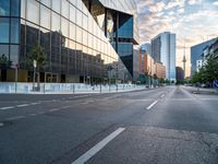 This stock photo showcases an empty city street in Berlin, Germany during the break of day. The image features a clear sky, with some buildings in the background. The modern architecture of the office buildings and skyscrapers adds a futuristic touch to the cityscape. The glass walls and windows reflect the light, creating a stunning visual effect. The asphalt road surface and curbs can be seen in the foreground, surrounded by trees. This image captures the urban design and structure of a business district in Berlin, making it perfect for architectural and business-related projects.