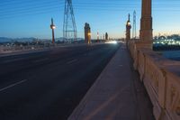 Empty city street at night, illuminated by the warm glow of sunset. Clear sky contrasts with the artificial lights and streetlights that line the road. The urban panorama features a bridge in the distance.