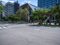 This stock photo depicts an empty city street in Taipei City, Taiwan. The street is lined with tall buildings and trees, creating a beautiful blend of urban and natural elements. The street is paved with asphalt, and a red fire hydrant is situated in the middle. The clear sky and modern architecture in the background add a contemporary and futuristic touch to the scene. This image perfectly captures the essence of city life in Taipei City, showcasing its urban design and vibrant atmosphere.