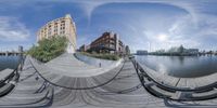 the 360 - ray panorama shows an empty city waterfront in the distance, buildings and a bridge